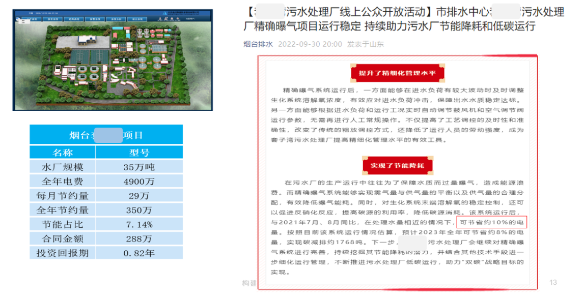 煙臺(tái)市某污水廠,每日處理能力35萬噸,對(duì)全廠曝氣系統(tǒng)進(jìn)行智能化升級(jí),可節(jié)電10%,不到1年,收回建設(shè)成本。
